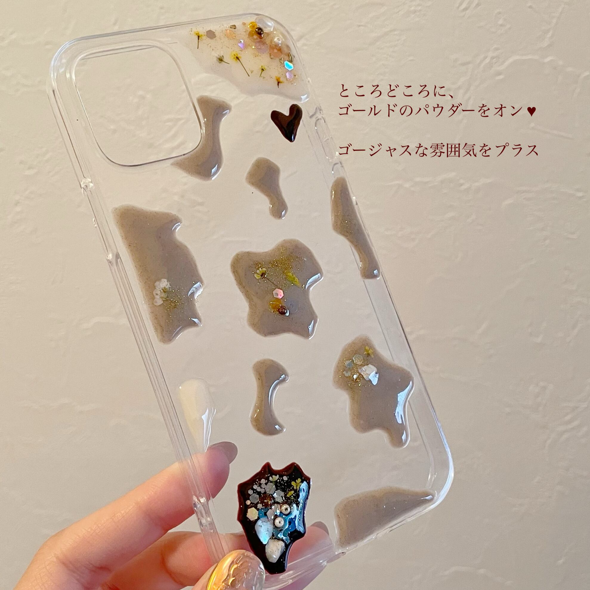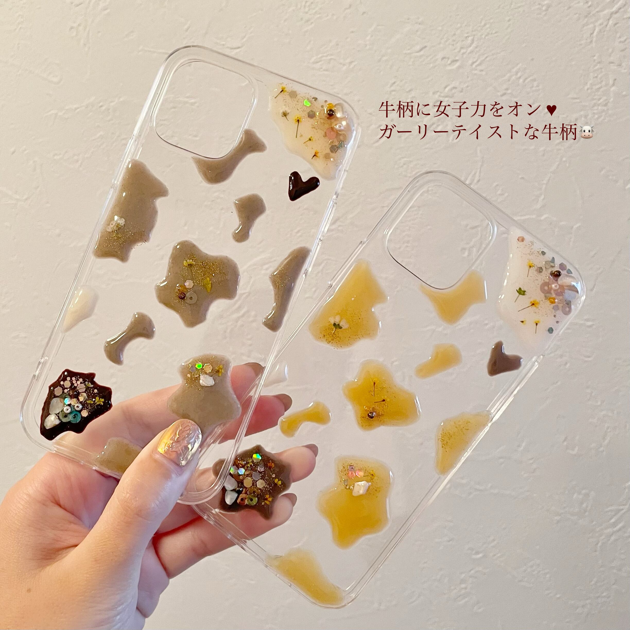 スマホケース 押し花 牛柄 ニュアンスカラー アイボリー ブラウン フレンチガーリー